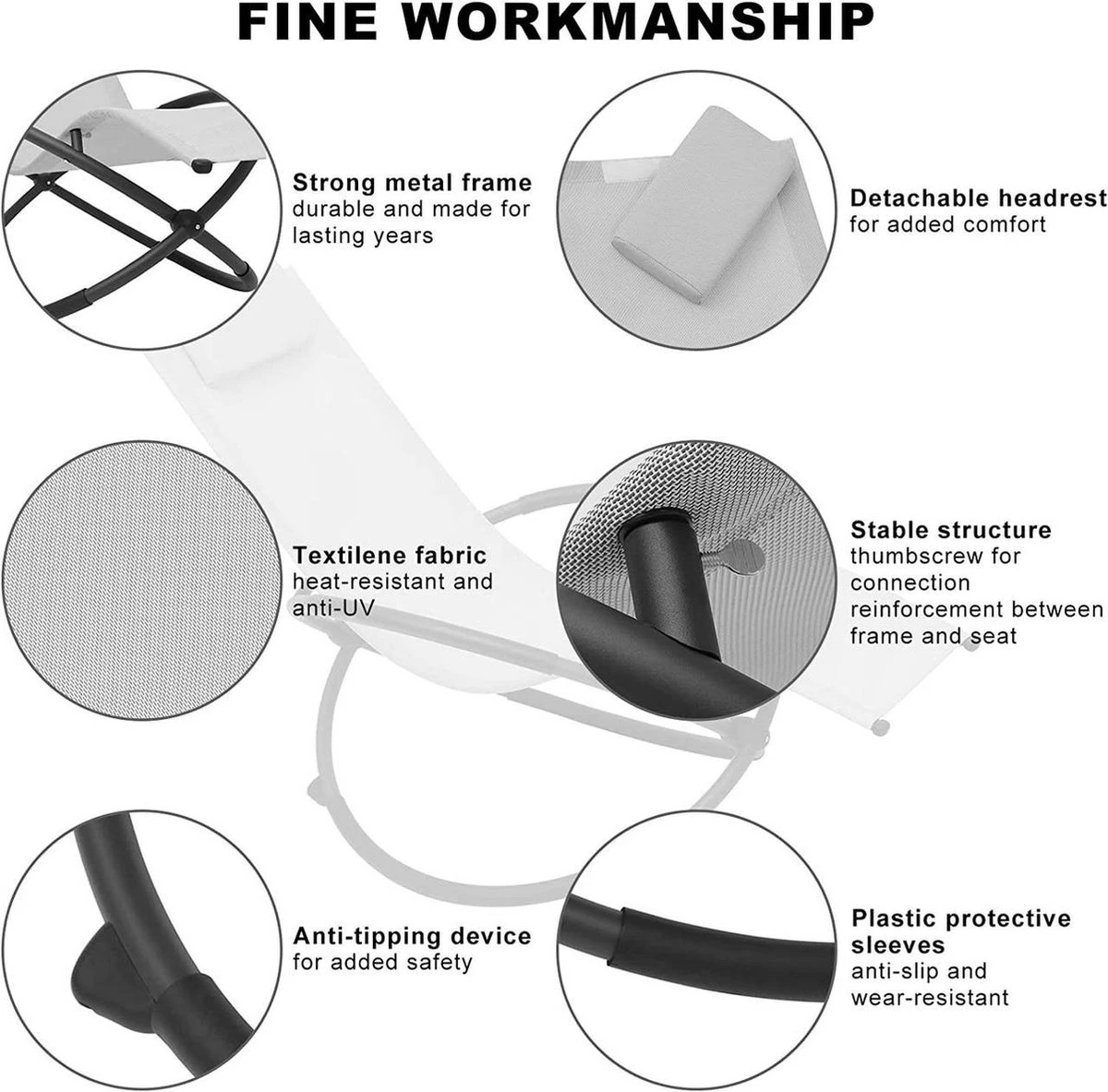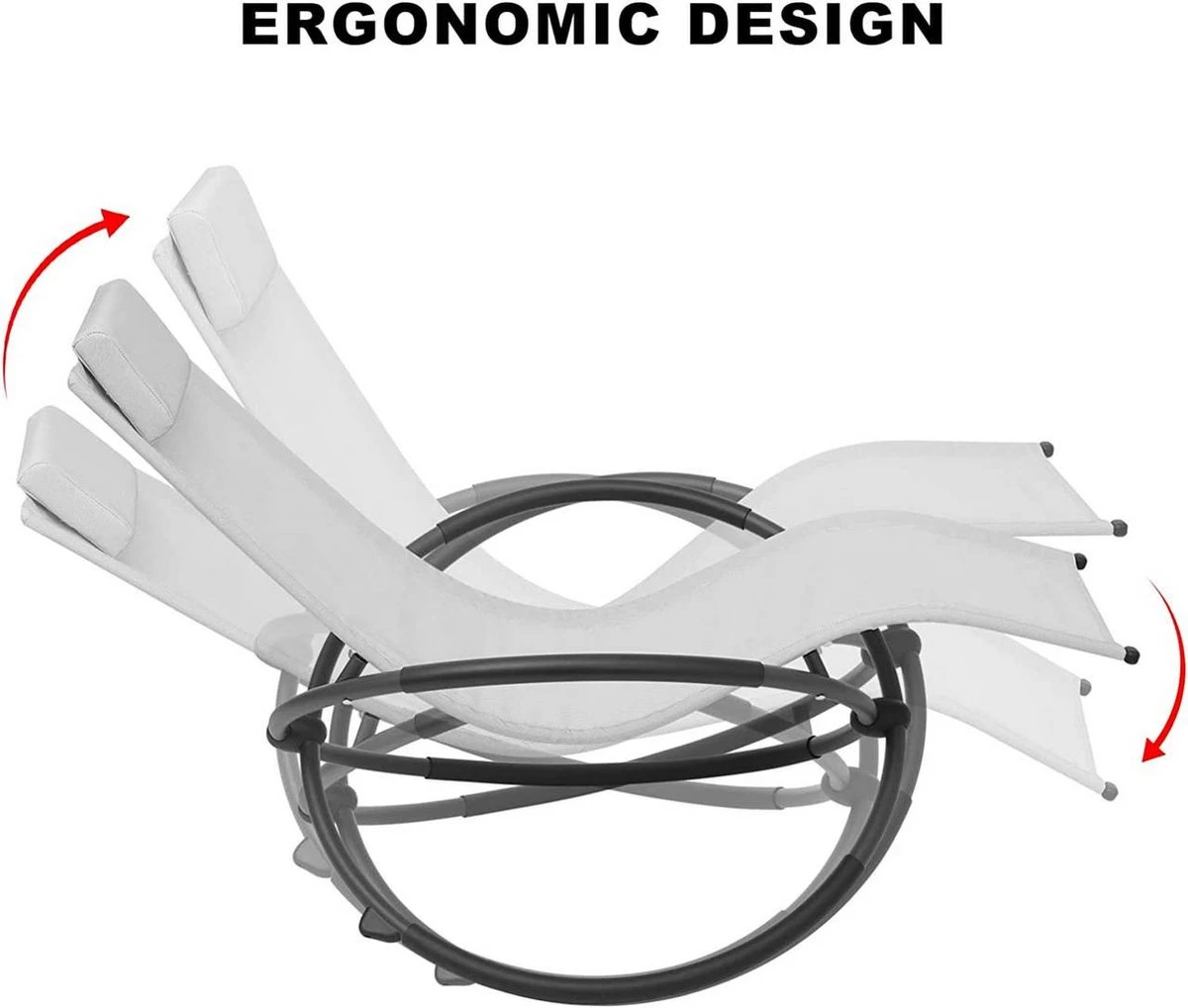 - Grâce au cadre incurvé, la chaise longue peut osciller d’avant en arrière. Vous pouvez vous allonger ou vous asseoir, comme vous le souhaitez. Il peut remplir sa fonction de chaise de plage, de chaise de jardin, de chaise longue, de fauteuil inclinable au bureau et bien plus encore.