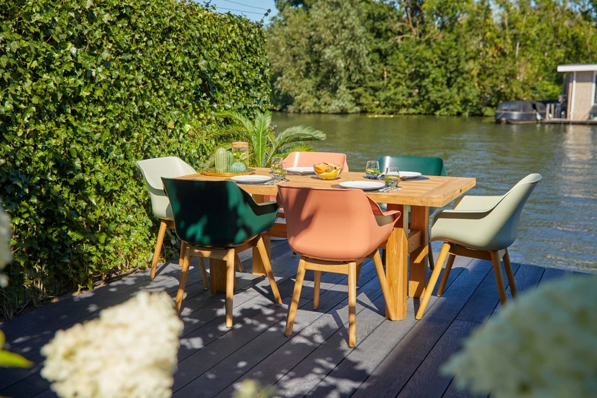 La coque en plastique est préformée, ce qui garantit que la chaise offre un confort d’assise ergonomique et est donc très confortable. La couleur vert menthe fraîche de cette chaise crée un look tendance dans votre jardin. La structure de la chaise Hartman Sophie Studio est en teck. Ce matériau a été choisi pour donner à la chaise un bel aspect naturel. Heureusement, ce matériel nécessite peu d’entretien. Le teak est un produit naturel qui peut commencer à agir s’il est laissé à l’extérieur. C’est facile à garder beau en traitant le bois en moyenne une fois par an avec un nettoyant pour teak et un protecteur pour teak .
