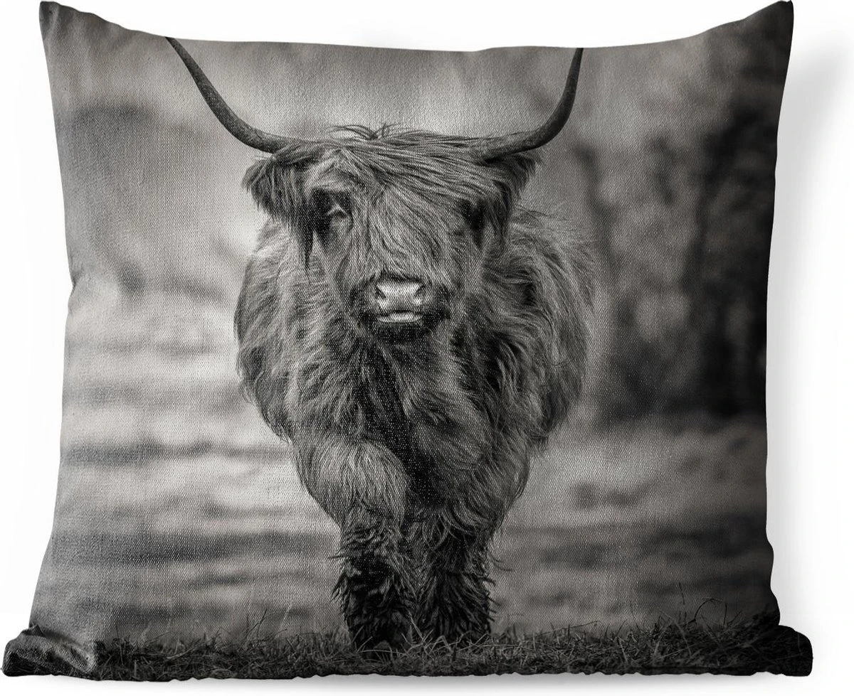 Ce montagnard écossais avec sa fourrure sauvage est représenté de face. L’animal se dirige vers la caméra.
