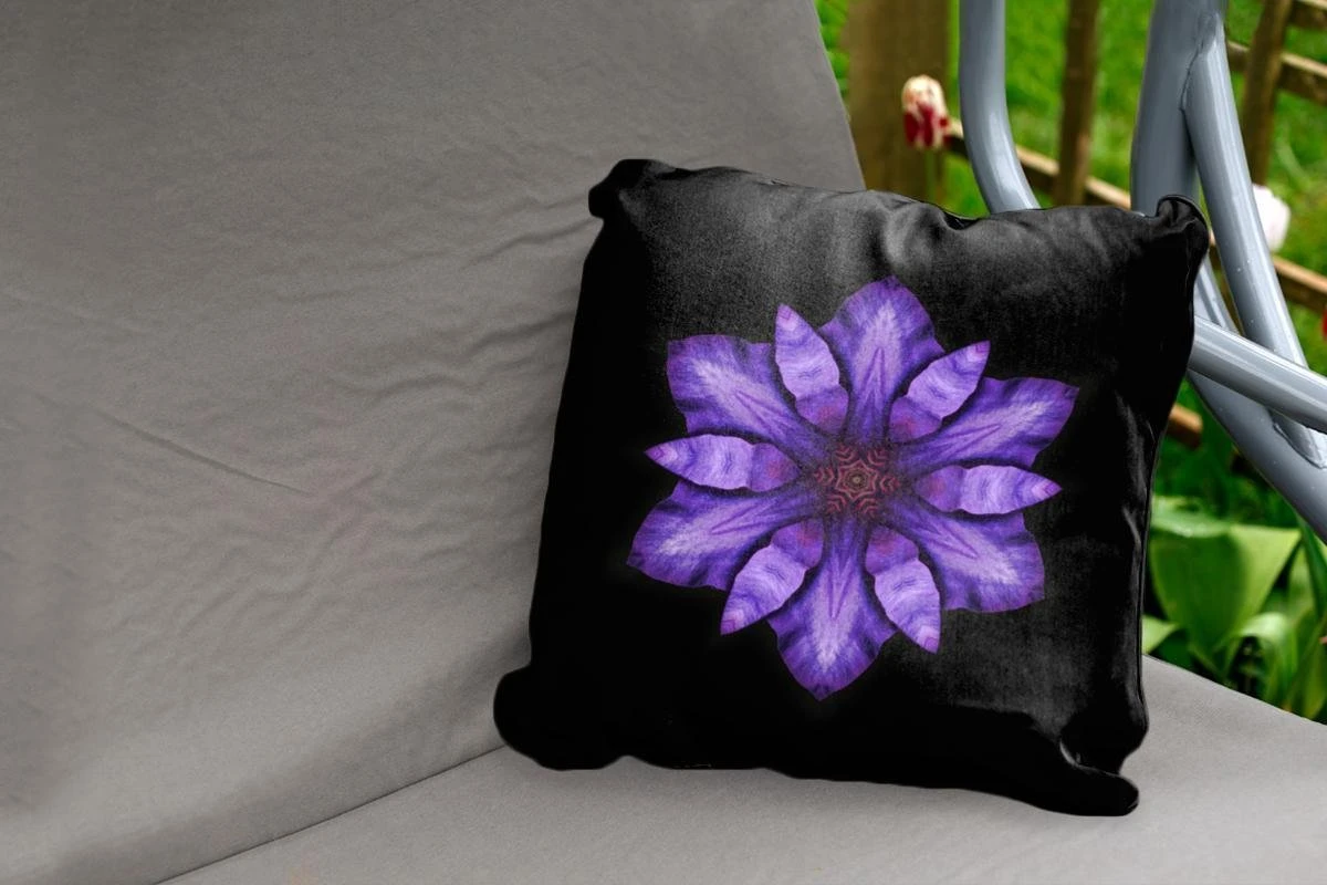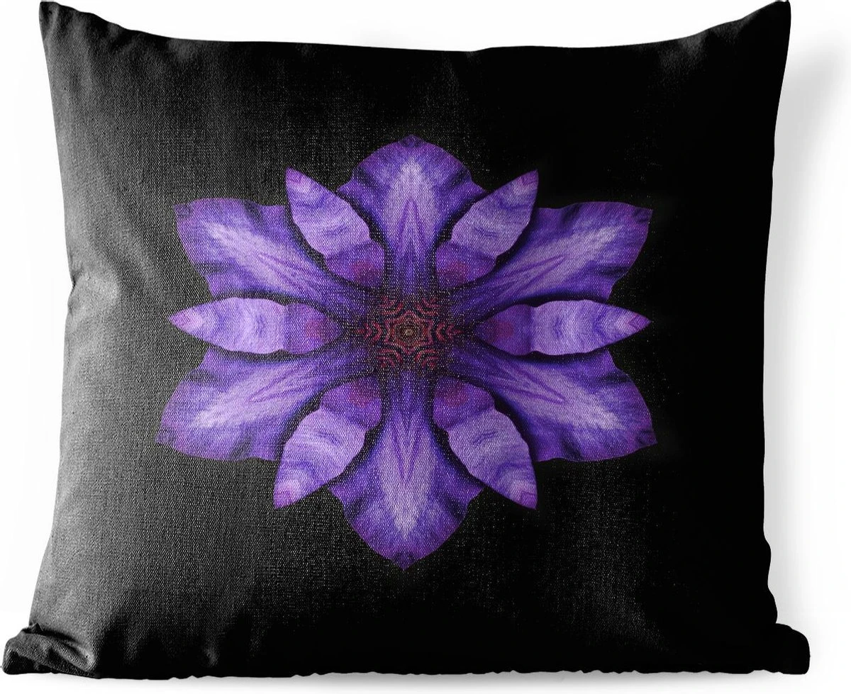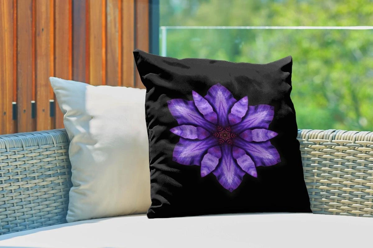 Sierkussen Mandala Outdoor – Un Mandala Clématite Violet Sur Fond Noir – 50×50 Cm – Coussin Carré De Jardin Résistant Aux Intempéries / Coussin De Salon De Jardin En Polyester
