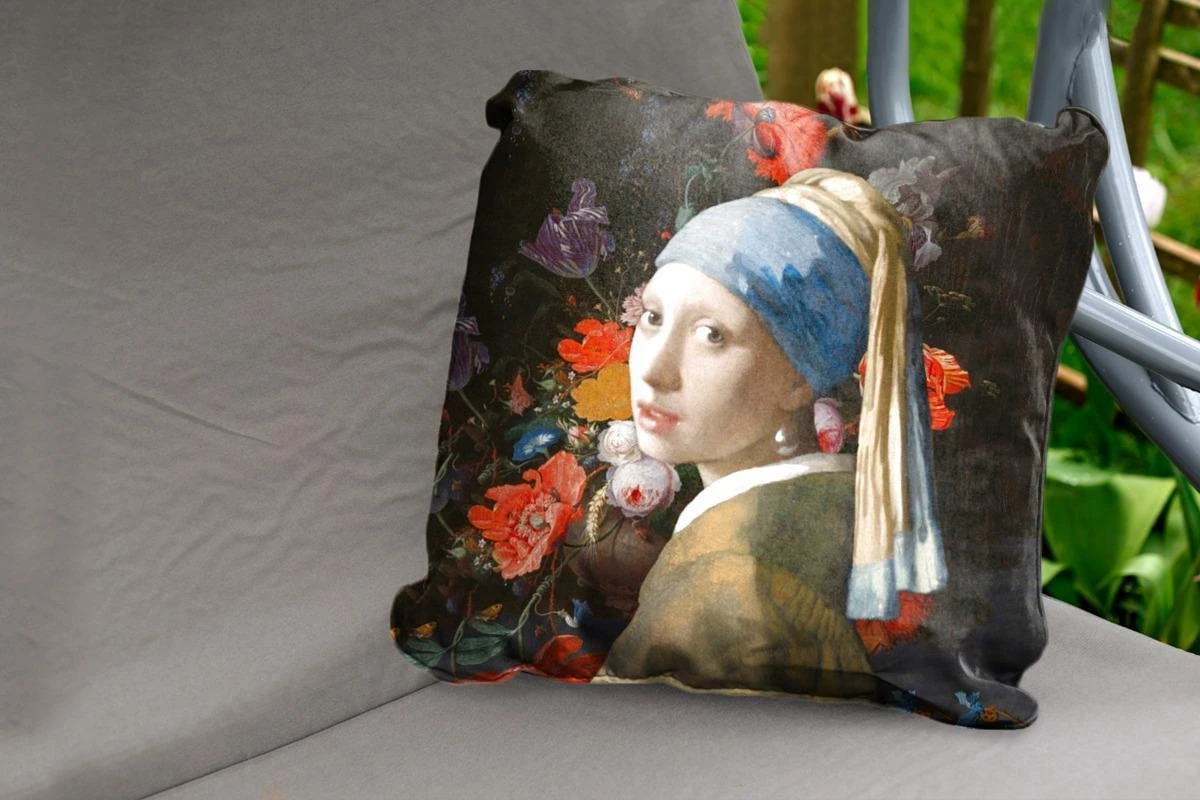 Fille avec une boucle d’oreille de perle par le vieux maître Johannes Vermeer avec une nature morte de fleurs.
