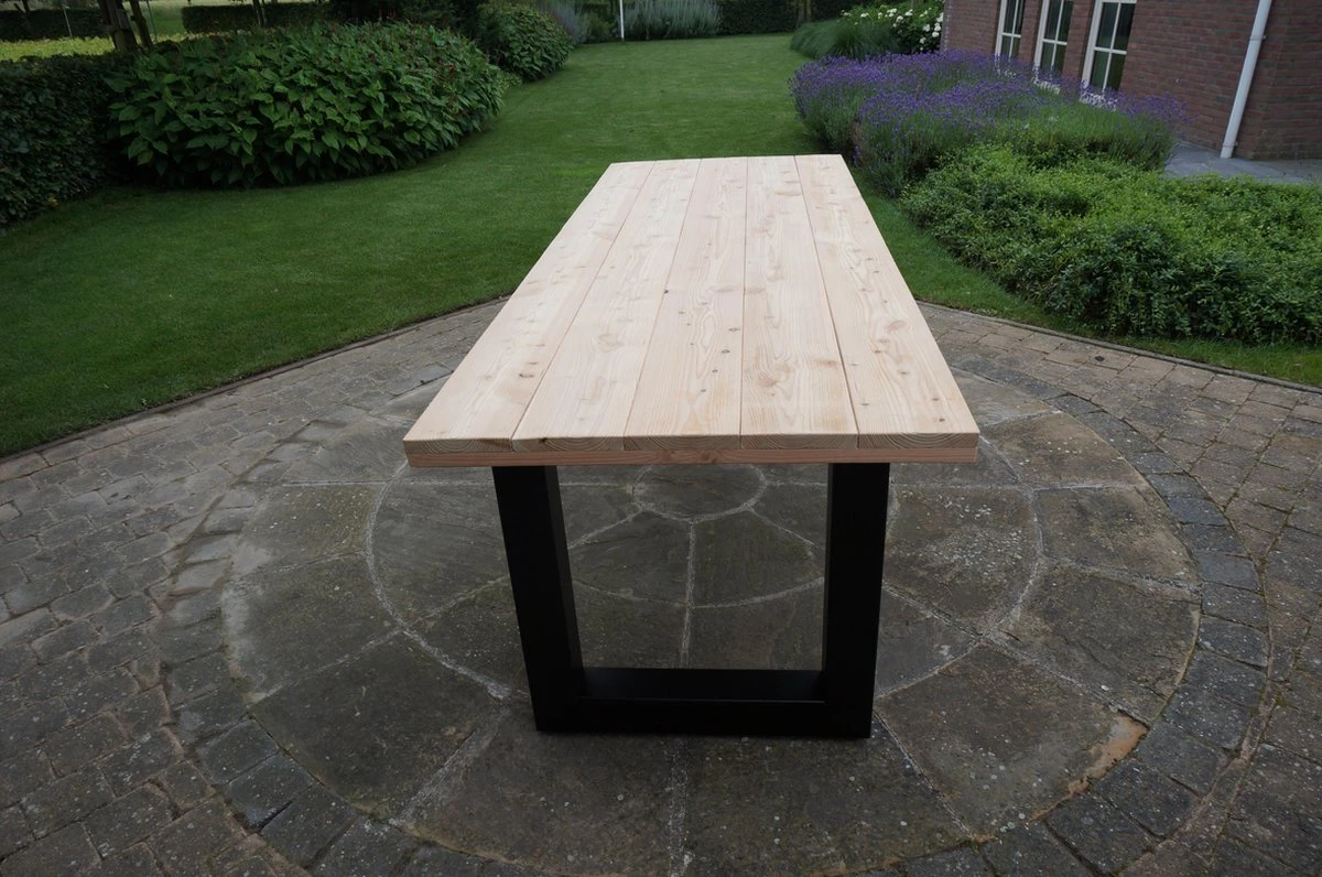 Cette table à manger industrielle convient à une utilisation intérieure et extérieure. Le plateau est fait de planches de douglas de 32 mm d’épaisseur et dispose ensuite d’un bord épaissi sous le plateau pour que la table ait une apparence robuste. Le bois est poncé plat et lisse et non pourvu d’une couche de protection. La table peut vieillir avec le temps en raison des influences météorologiques. Les bases sont constituées de profilés caissons en acier et revêtues d’un revêtement en poudre noir mat. La table est disponible avec une base X et U.