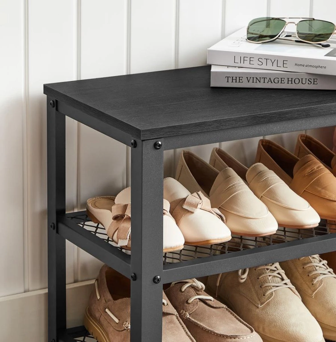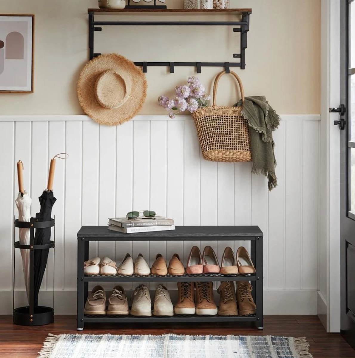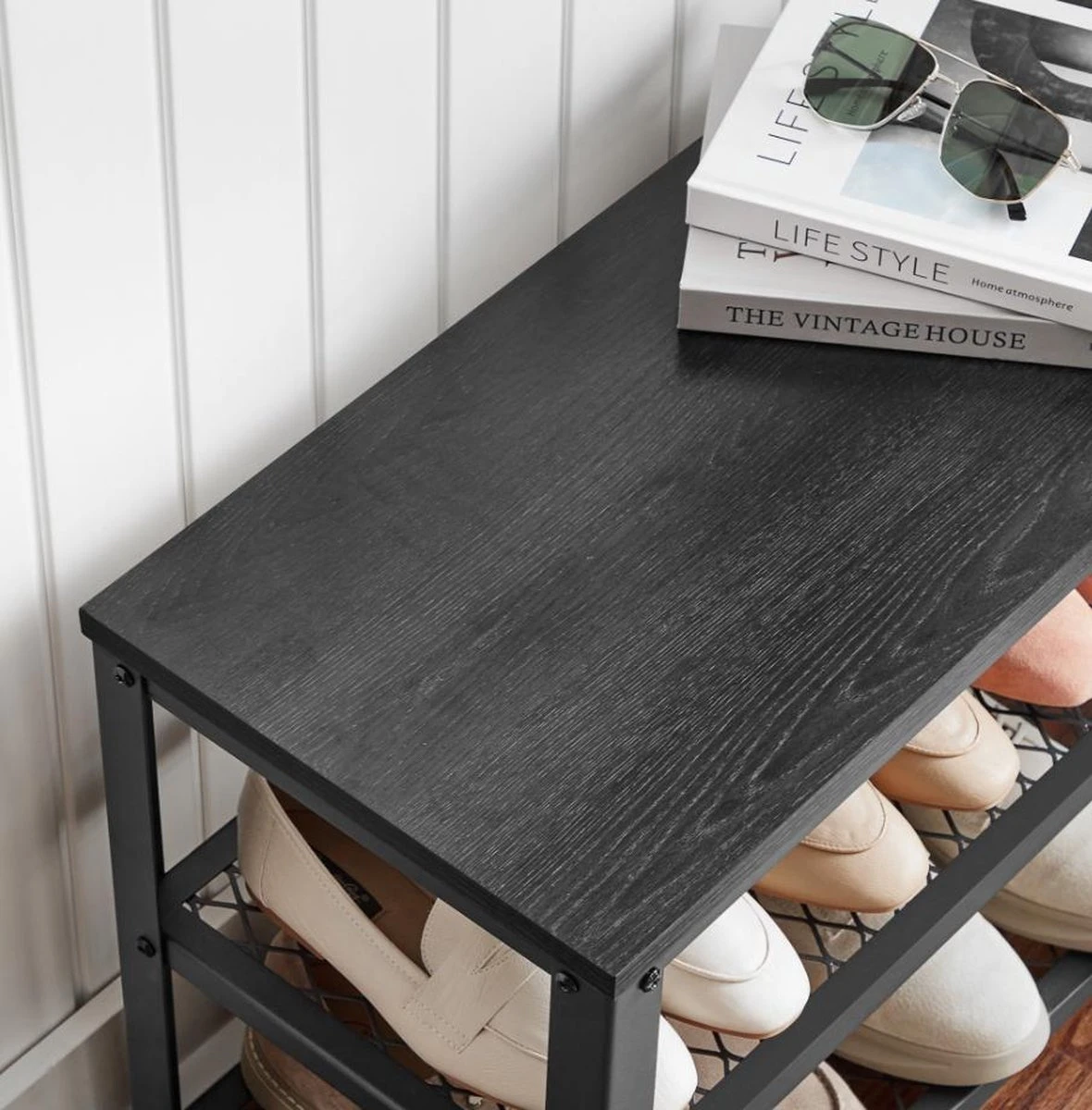 STYLE À LA MODE : Cette étagère à chaussures industrielle est le bon choix si vous recherchez un ajout unique à votre couloir. Placez vos chaussures sur les deux supports en métal et utilisez le dessus pour d’autres articles essentiels si vous le souhaitez. Aspect : cette étagère murale a un bel aspect bois et un cadre en métal qui offre résistance et support stable. Vous pouvez ranger différents types de chaussures sur ces étagères en métal ! COMME DÉCORATION : Cette étagère à chaussures entièrement noire transforme un couloir nu en un espace joliment décoré et utilisable, parfait pour placer tous vos accessoires. DIMENSIONS : 88x30x45 cm