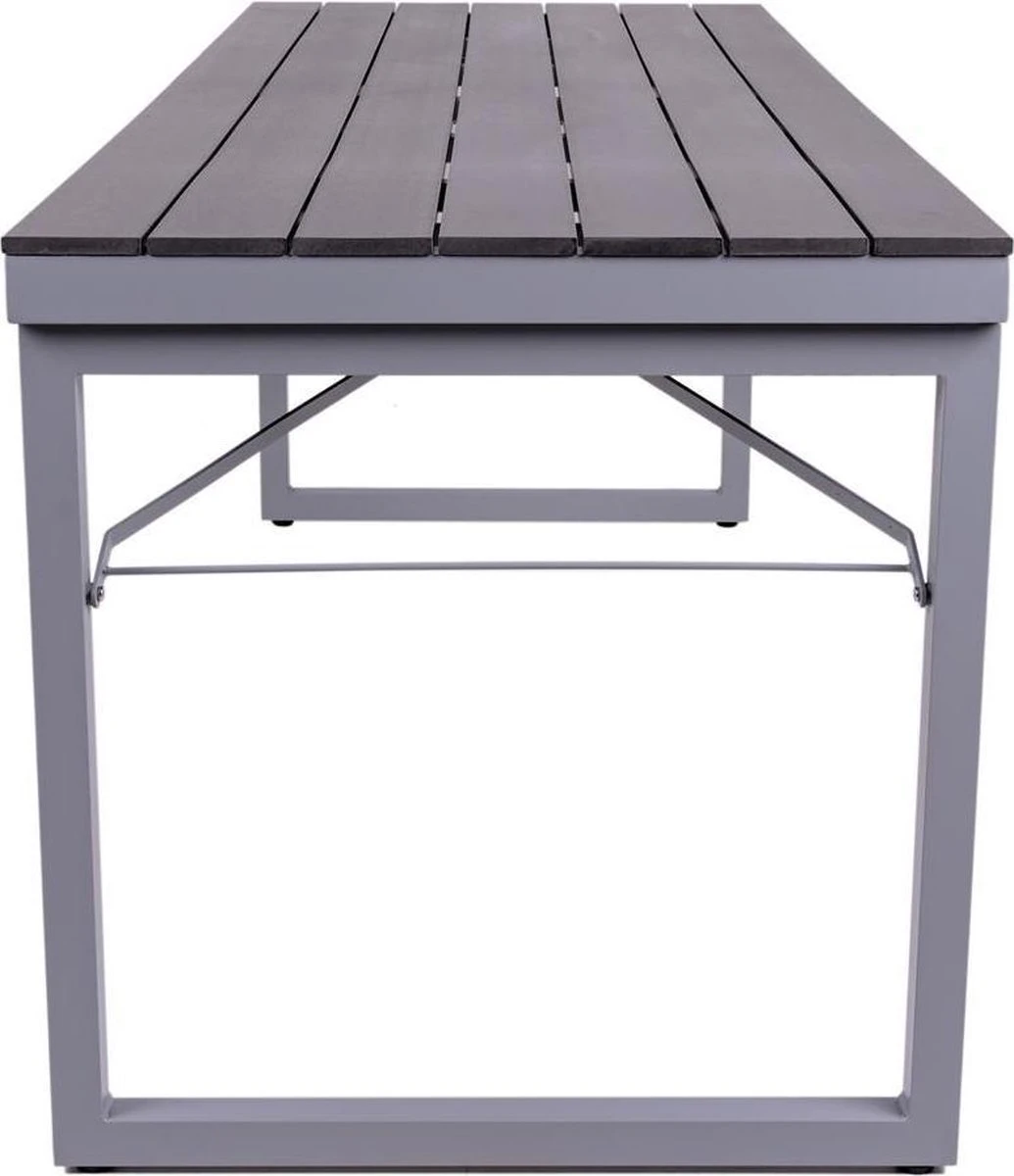Cette table de 200 cm de long a un plateau de 72 cm de large et 75 cm de haut. Sous le cadre en aluminium se trouvent des pieds réglables pratiques pour que votre table soit stable.