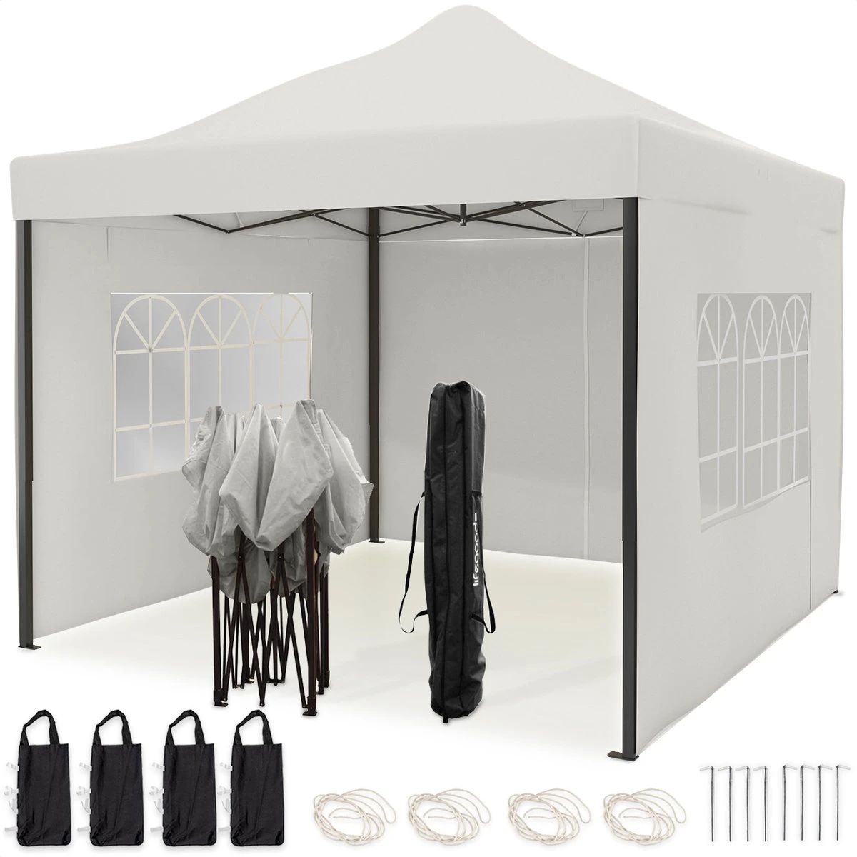 La tente de fête est livrée avec des accessoires supplémentaires pour fixer la tente au sol. 4 sacs de sable sont inclus pour le rendre plus lourd. Vous pouvez remplir vous-même les sacs de sable jusqu’à 10 kg. De plus, 8 piquets et 4 haubans sont inclus pour resserrer la toile de la tente. Parce que la tente de fête ne peut pas résister aux vents forts, un sac de transport pratique est également inclus pour ranger la tente de fête.