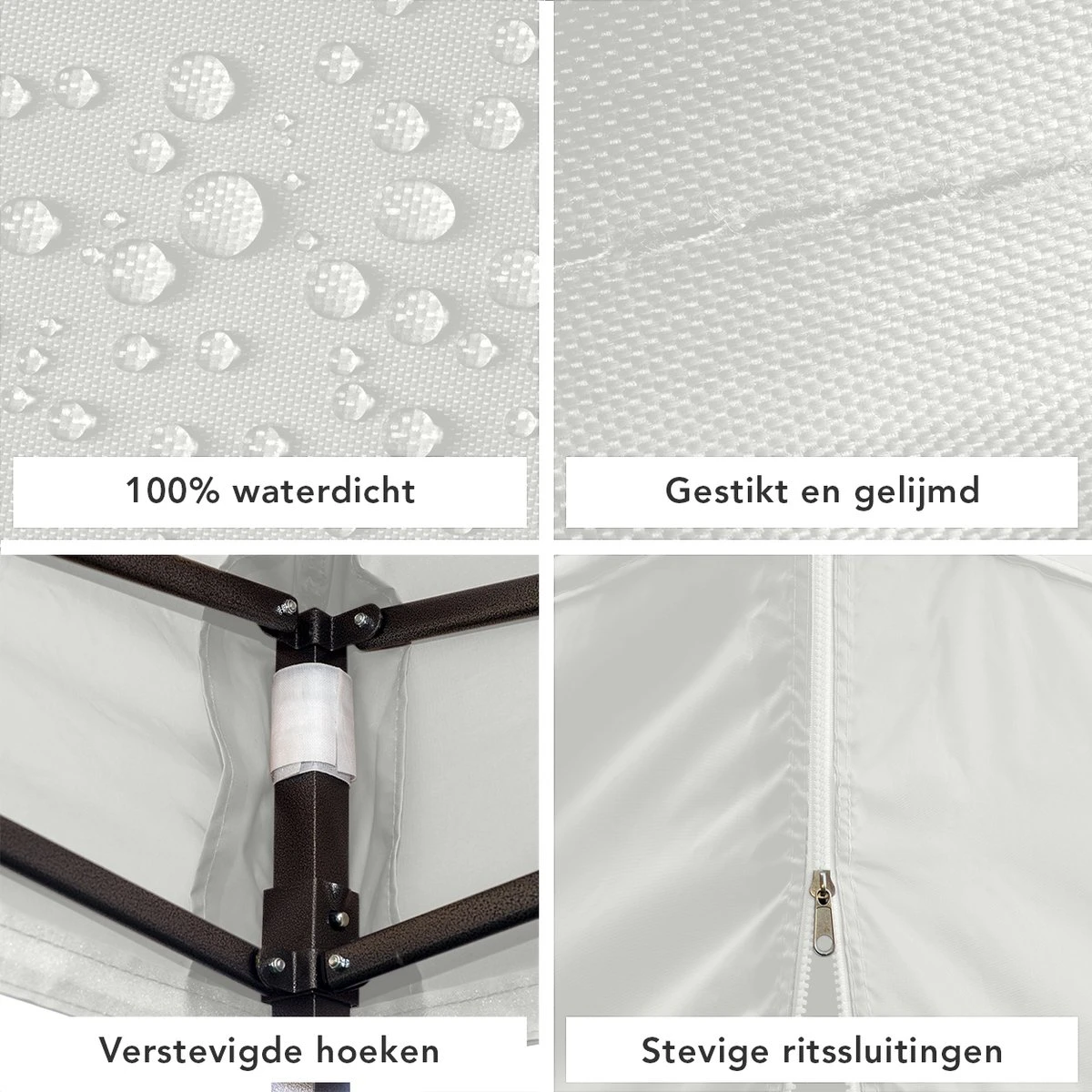 La construction de la tente de réception est très stable et robuste. Tous les coins sont renforcés avec une couche supplémentaire de tissu. La toile de la tente de fête est en polyester épais avec du nylon. Le cadre en acier robuste associé à la construction solide en harmonica garantit que cette tente de fête peut prendre un coup !