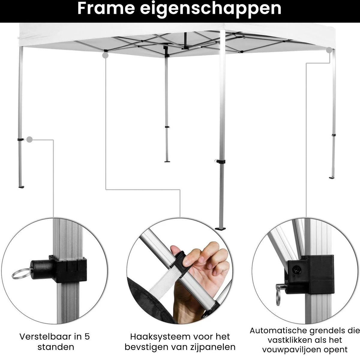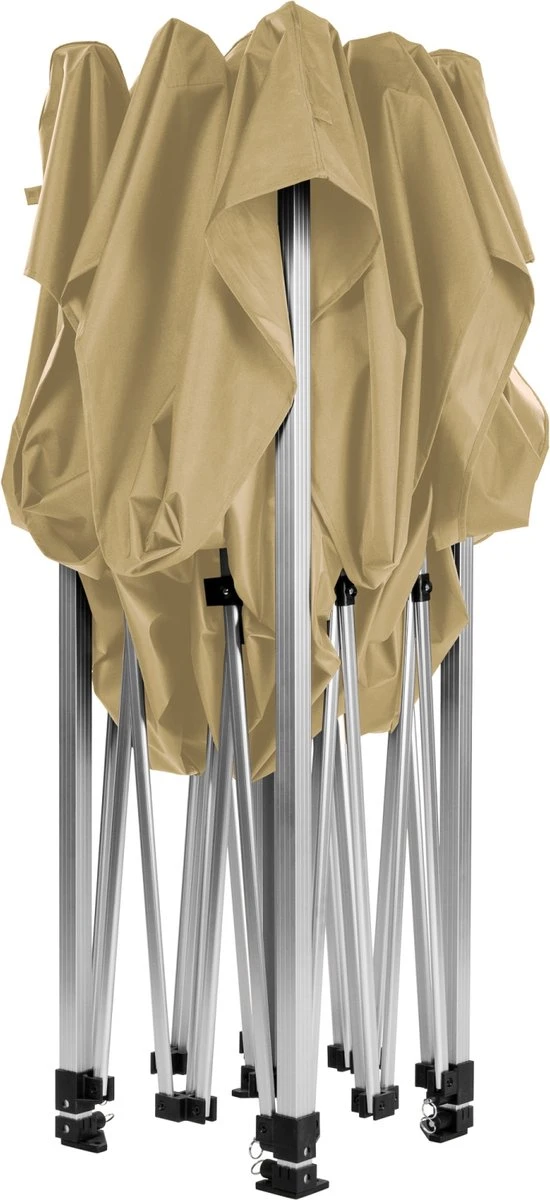 Le pavillon pliant a une grande stabilité et est équipé d’un pied télescopique solide, d’un cadre de rasage, de pieds de support élargis, de pièces de raccordement robustes et d’un réglage à 5 niveaux de 310-340 cm (hauteur de passage 177-207 cm). Le pavillon est également équipé d’un système de clic pratique avec verrouillage. De plus, le toit est en polyester 300D 300 g/m² et dispose d’un revêtement PVC supplémentaire pour la résistance à l’eau. Le cadre est en aluminium EV1, ce qui le rend résistant à la rouille.