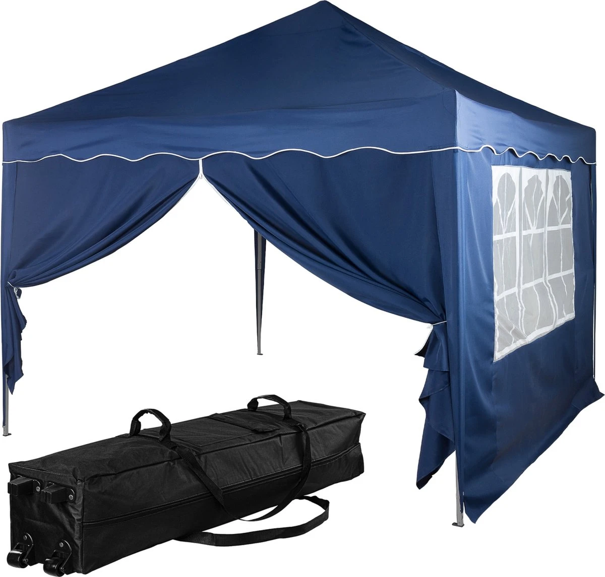 Le pavillon pliable est de couleur bleue et est en acier avec un tissu en polyester. Le grand pavillon est non seulement résistant aux intempéries, mais également idéal pour une utilisation en extérieur. La taille de cette tente de réception est de 3 x 3 mètres avec un capot amovible. De plus, vous pouvez facilement installer la tente de réception et elle est livrée avec un sac de transport pour chariot.