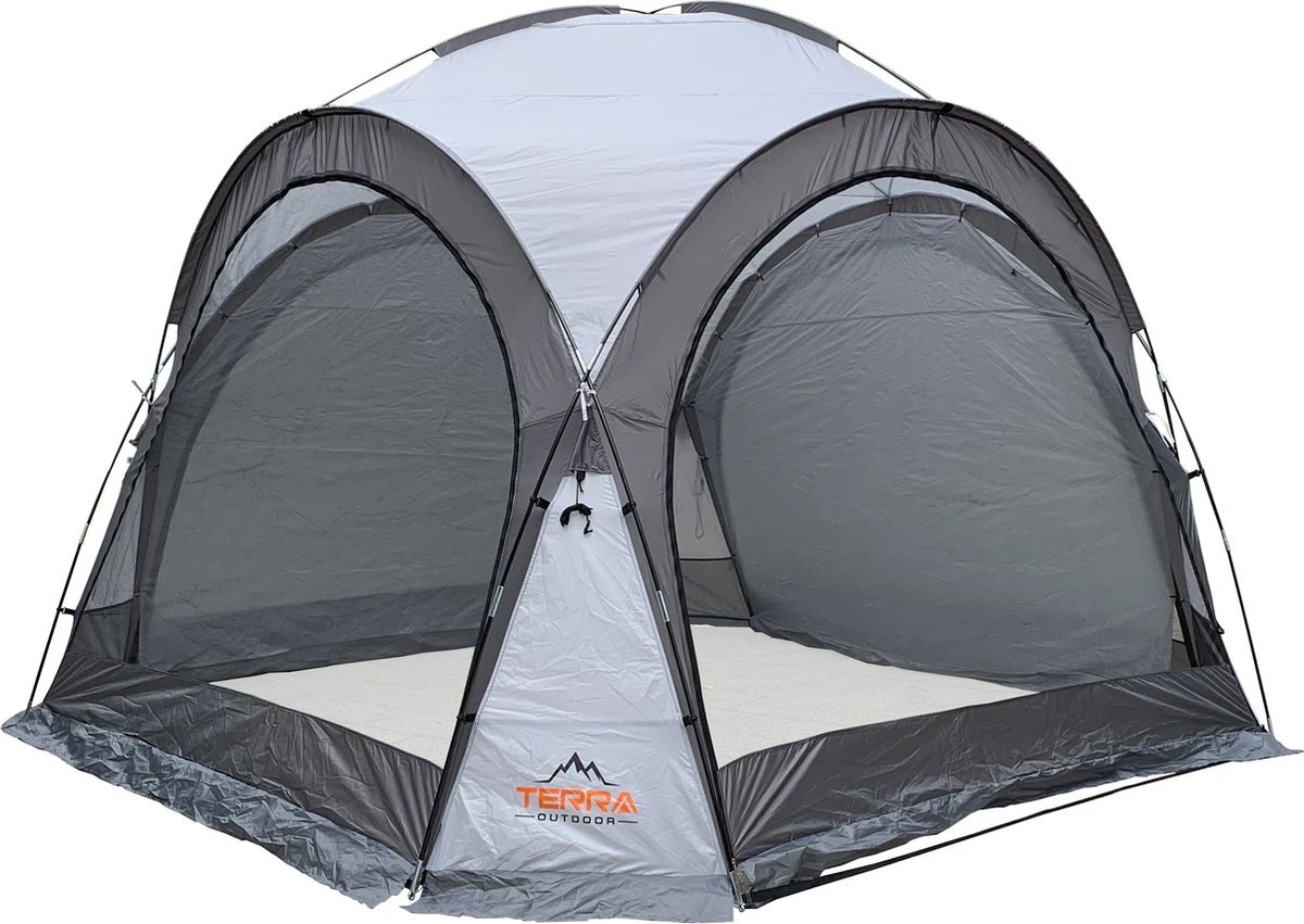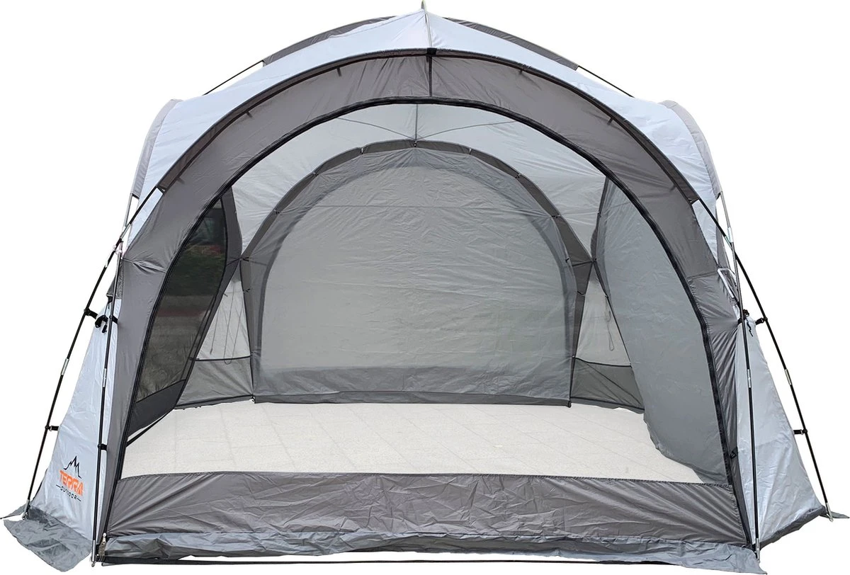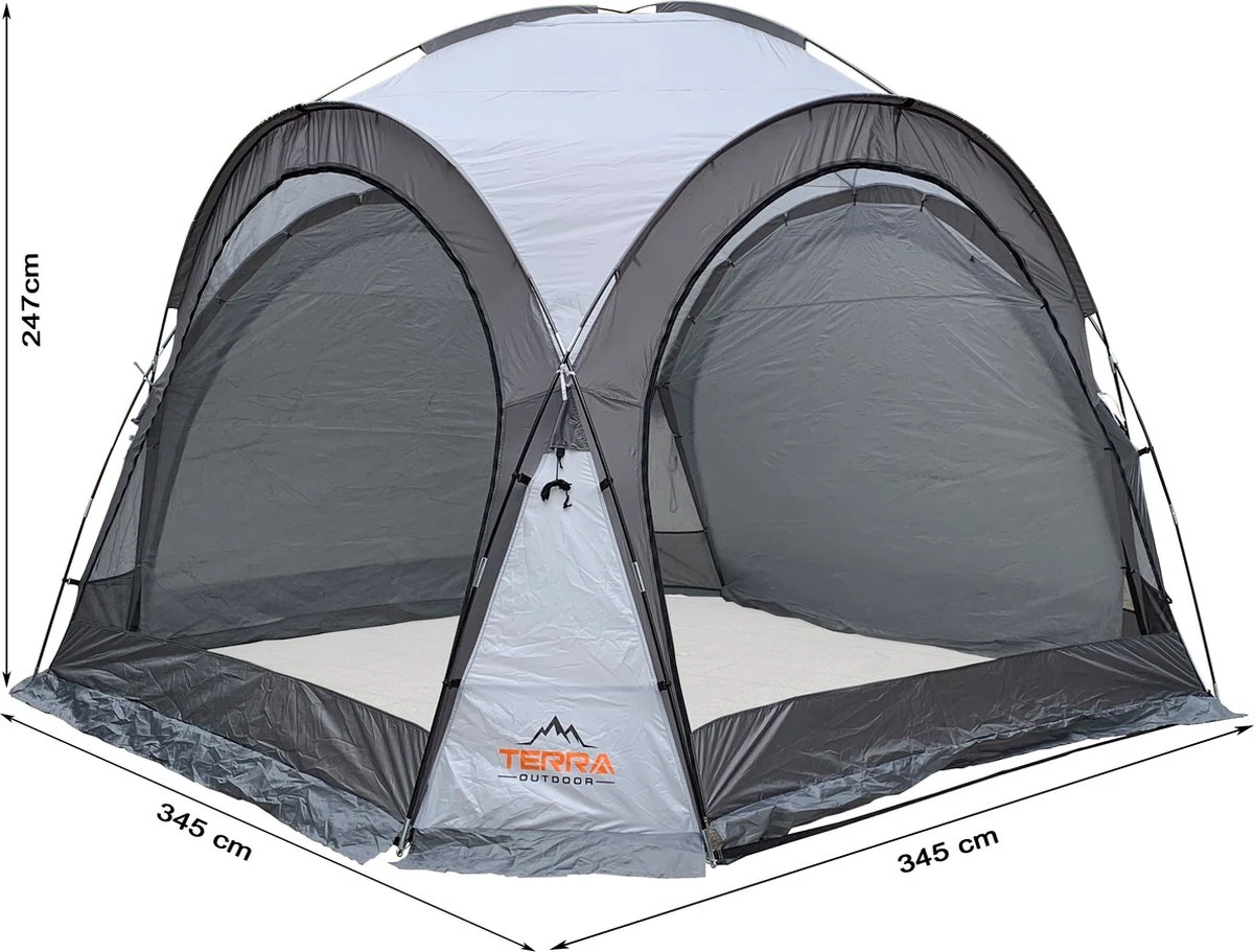 Bien entendu, le pavillon peut également être emporté au camping. Pendant la journée, il fournit de l’ombre, le soir, il protège contre les moustiques et sert de brise-vent.
