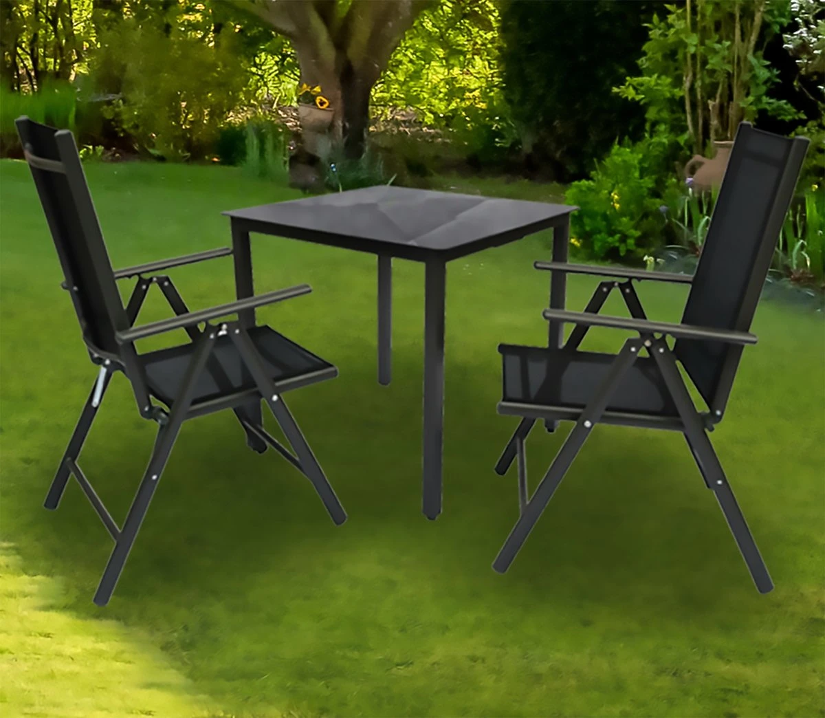 Points forts : Table : – Dimensions de la table environ h. 76 x l. 80 x j. 80 cm – Couleur aluminium : anthracite – Plateau de table en verre de sécurité ESG Points forts : Chaises: – Dimensions de la chaise env. 105 x l. 56 x j. 65 cm – Couleur aluminium : anthracite – Les Chaises peuvent être pliées pour gagner de la place – Dossiers réglables en 3 positions Le salon textile est livré avec une table de 80 x 80 cm et des chaises pliantes confortables. Les meubles sont fabriqués en aluminium de très haute qualité et sont donc extrêmement résistants aux intempéries et aux UV. La table robuste a un plateau en verre de sécurité. Les accoudoirs et les dossiers réglables offrent un confort supplémentaire. Lorsqu’ils ne sont pas utilisés, les sièges peuvent être pliés pour gagner de la place. VCM s’est spécialisé dans la conception, la production et la distribution de meubles au juste rapport qualité-prix depuis les années 1970 et a embelli des millions de foyers avec.