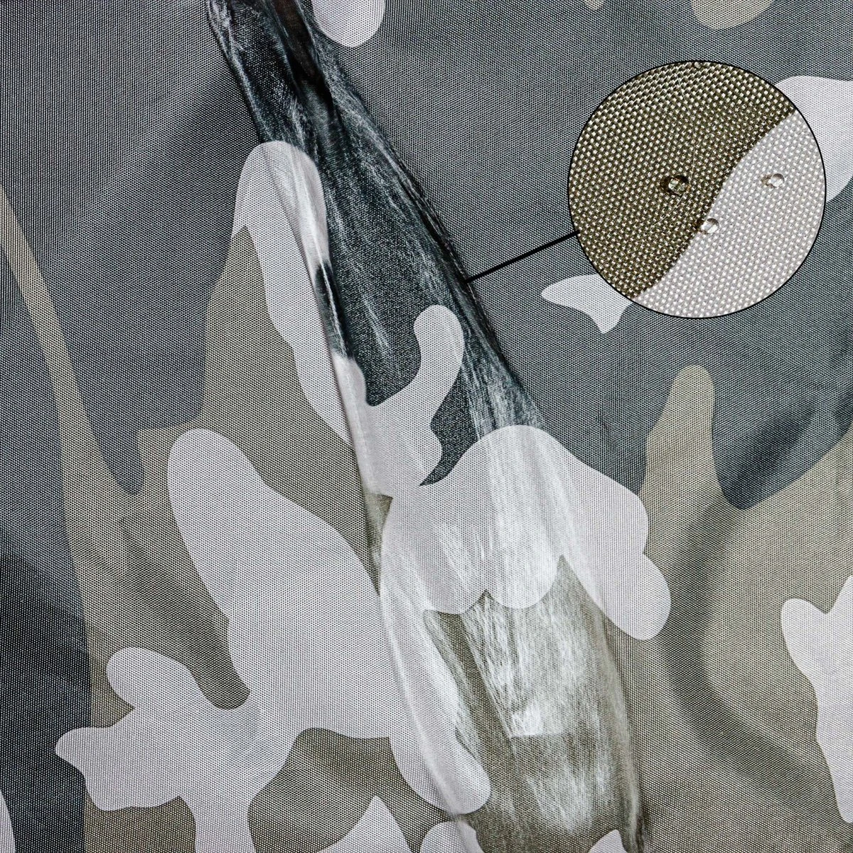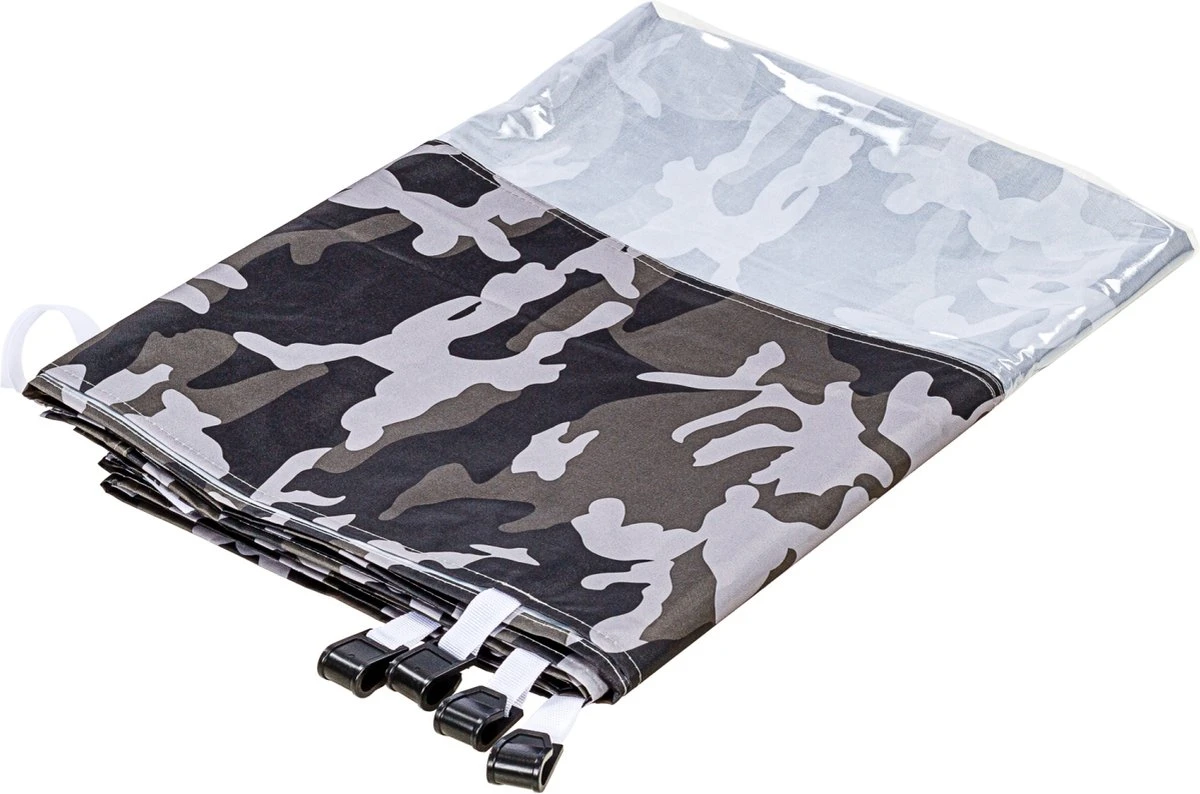 La paroi latérale du pavillon a une couleur camouflage et est en polyester. Cela garantit que la paroi latérale est hydrofuge et respirante, ce qui est important pour l’accumulation de chaleur. Les parois latérales contiennent également une fenêtre.